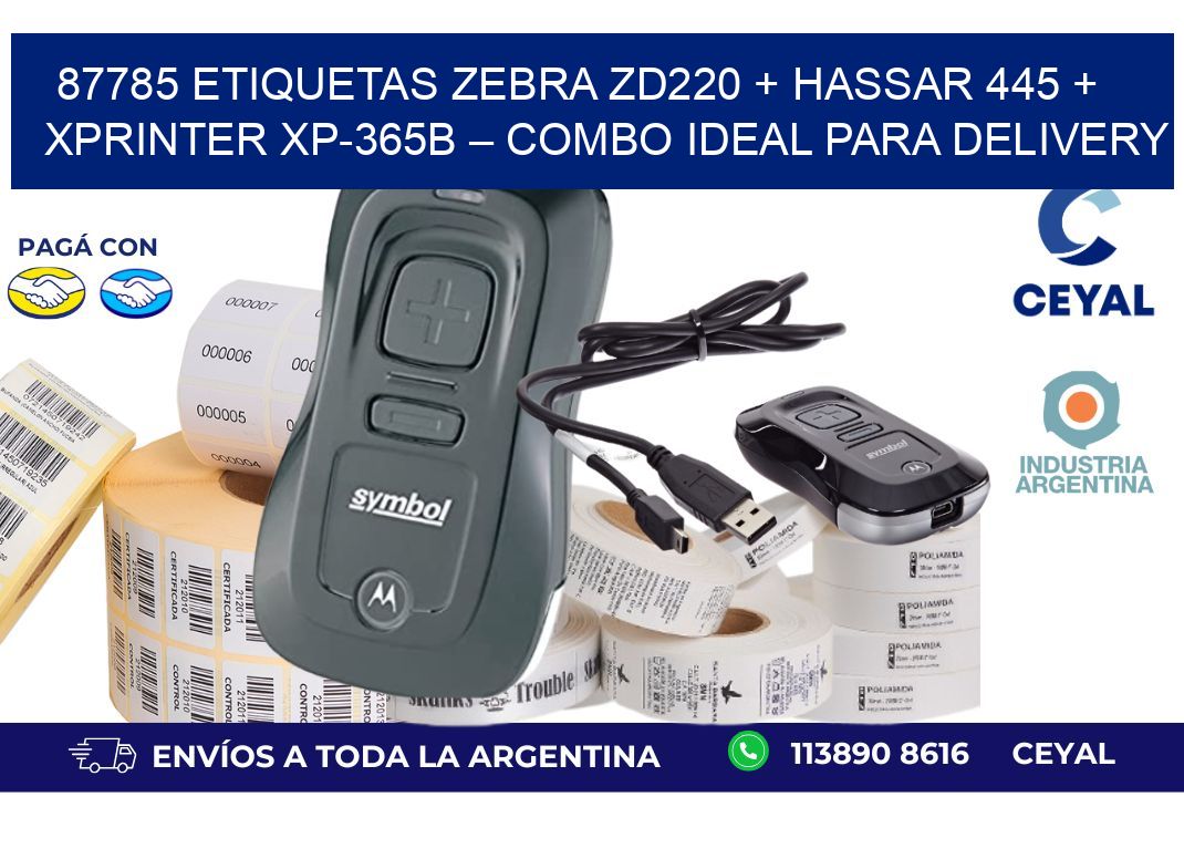 87785 ETIQUETAS Zebra ZD220 + Hassar 445 + Xprinter XP-365B – Combo ideal para delivery